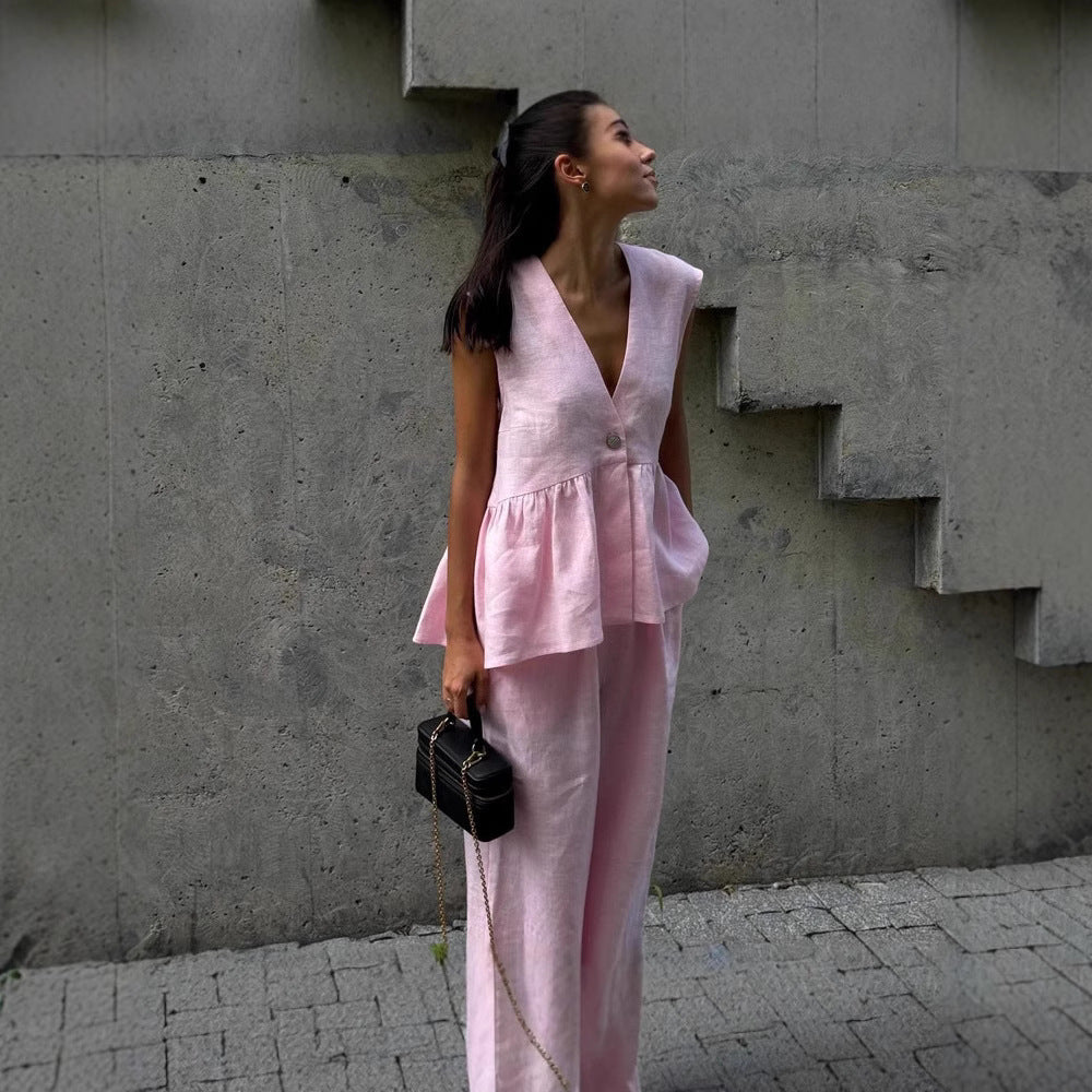 W połączeniu z szerokimi lnianymi spodniami ten zestaw zapewni Ci swobodny, a zarazem stylowy wygląd, idealny na ciepłe dni. Delikatny pastelowy róż podkreśla jego elegancki i naturalny urok. Oddychająca tkanina lniana sprawia, że ubranie idealnie nadaje się na niezobowiązujące wyjścia, wakacje czy letnie brunche.