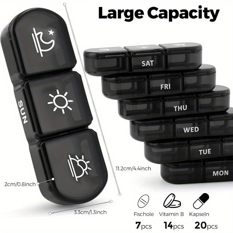 NAGY KAPACITÁSÚ, 7 NAPOS SZERVEZŐ - Tervezze meg gyógyszeres kezelését egy egész hétre. Minden napi tartály három tágas rekesszel rendelkezik a reggeli, déli és esti adagok számára, így biztosan nem marad le a gyógyszeres kezelésről, ha úton van.