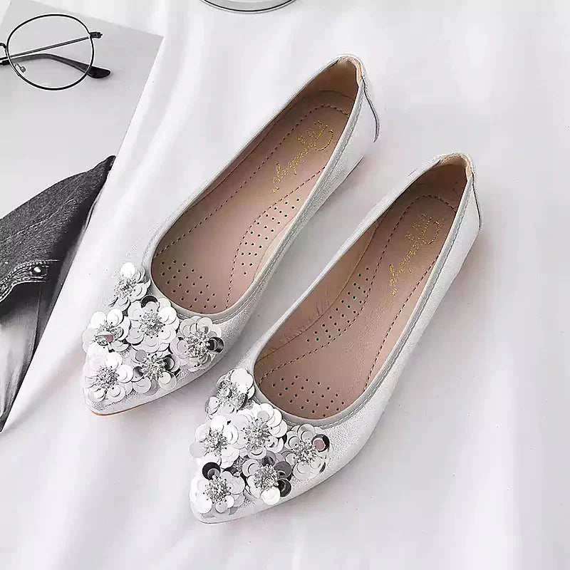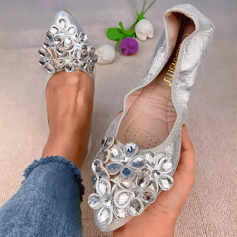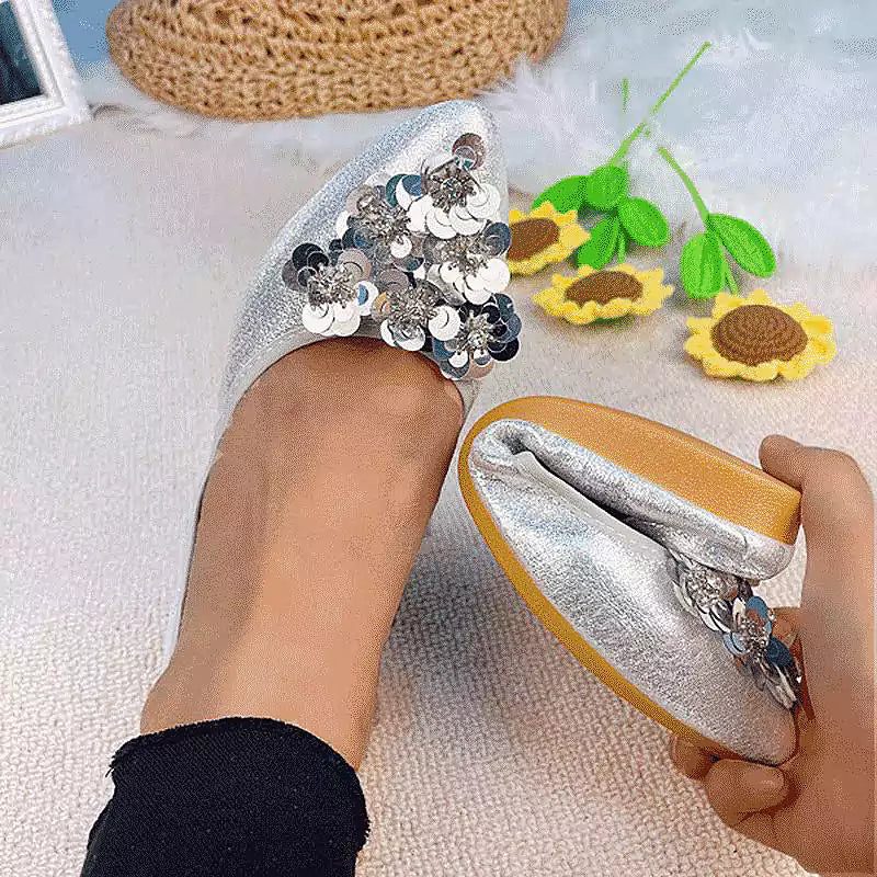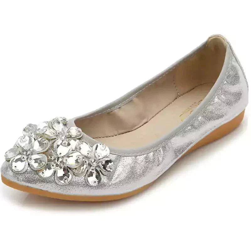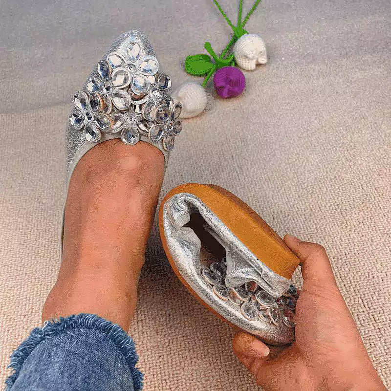Női balettcipő strasszokkal Esküvői balerina cipő Összecsukható, csillogó menyasszonyi slip-on cipő Ezüst díszítésű, alacsony sarkú cipő Róka papucs