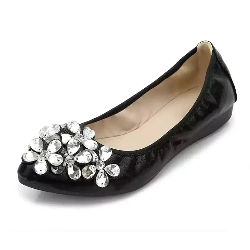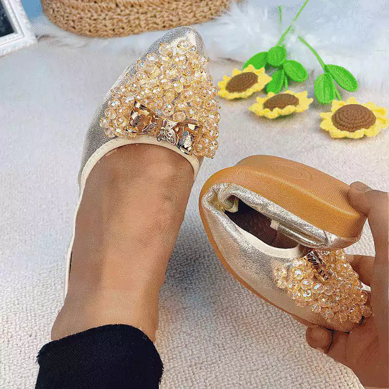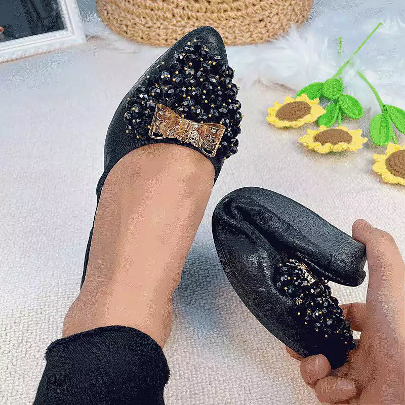 Kifinomult strassz díszítés, csillogó felső anyag, puha és vastagított gumitalp, elegáns hegyes orr, rugalmas szegély. Mindezek a tulajdonságok teszik a lapos cipőt kényelmes viseletűvé és tökéletessé esküvőre, partira, táncra, vezetésre, utazásra, irodába, találkozóra, ingázásra vagy mindennapi viseletre. Három szín közül választhat, így megtalálhatja azt a párat, amelyik tökéletesen illik az öltözékéhez és az adott alkalomhoz. Összecsukható kialakításának köszönhetően kis táskában is hordozható, és kényelmesen cserélheti a cipőjét, ha szükséges.