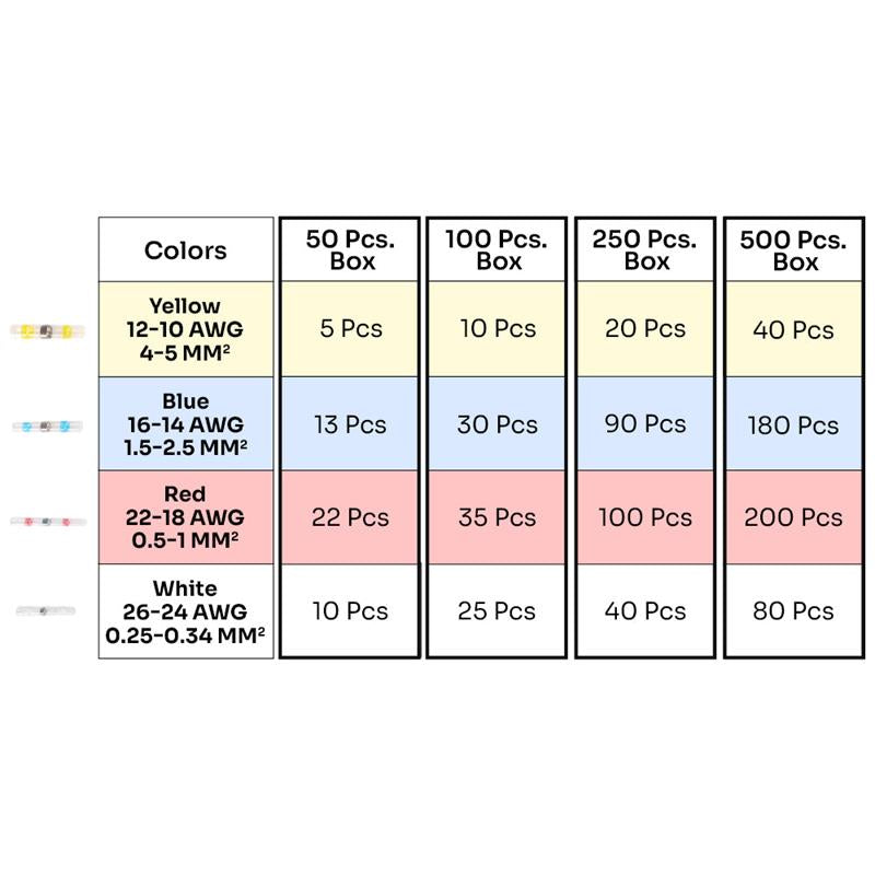 Bílá: 26-24 AWG / 0,25-0,34 mm² Červená: 22–18 AWG / 0,5–1,0 mm² Modrá: 16-14 AWG / 1,5-2,5 mm² Žlutá: 12-10AWG (4,0-6,0 mm² ) |