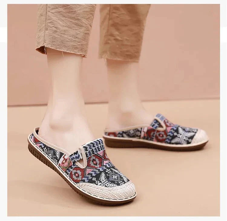 Ez egy pár mindennapi cipő pamutból és lenből. A felsőrész pamutból és lenvászonból készült, így légáteresztő és kényelmes mindennapi viselet. A cipő sarka rövidebb, így könnyebben fel- és levehető. A felsőrész mintája színes és etnikai jellegű, ami divatos karaktert kölcsönöz a cipőnek. A talp puha, jó tartást és kényelmet biztosít hosszabb járás közben. Ezek a cipők nem csak jól néznek ki, de nagyon praktikusak is, tökéletesek a mindennapi utazáshoz.